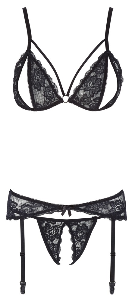 Deze driedelige jarretelleset verleidt met zijn delicate bloemenkant. De bh met verstelbare bandjes valt op door de banddetails bij de halslijn en de spannende spleetcups - geaccentueerd met een decoratieve sierring. De bijpassende jarretelgordel is smal gesneden en heeft verstelbare jarretelles. Beide lingeriedelen worden gesloten met een praktische clipsluiting aan de achterzijde. Het ensemble wordt afgerond met een volledig open snaar.