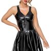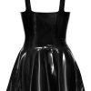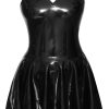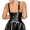 Eenvoudig en mooi getailleerd mini jurkje van LateX gemaakt van zwarte latex (dikte 0,35 mm). Huiddichte top met smalle bandjes bovenaan en een wijde zwierige rok onderaan.