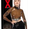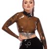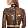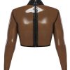 Buikvrij shirt met lange mouwen van LateX gemaakt van natuurlatex (gelijmd) in rookkleurige transparantie. Met een grote decoratieve metalen ring aan de voorkant onder de stijlvolle opstaande kraag. Met een doorlopende ritssluiting aan de achterkant voor gemakkelijk aan- en uitkleden.