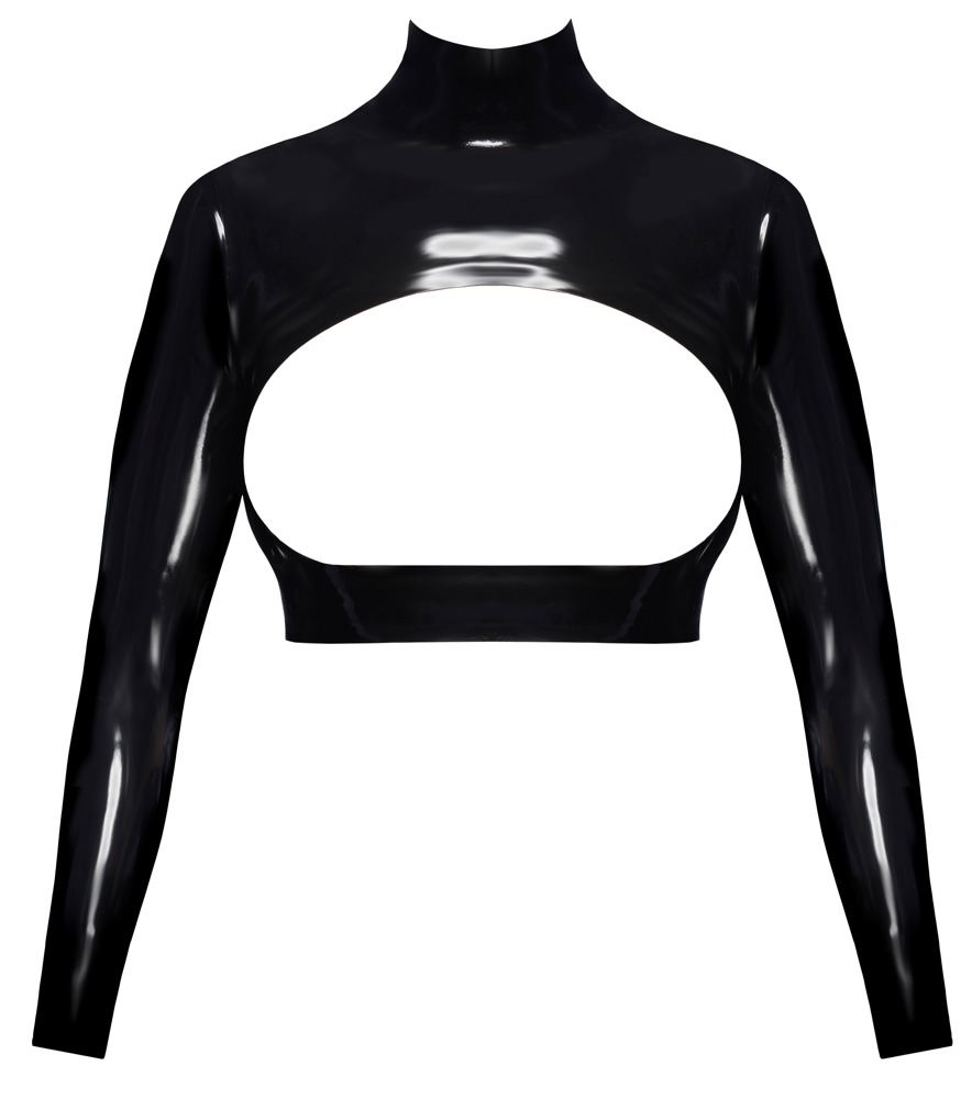 Buikvrij shirt van LateX gemaakt van zwart natuurlatex (dikte 0,35 mm) met een grote uitsparing aan de voorkant voor een adembenemende presentatie van de buste. Stijlvol elegant met een opstaande kraag en lange mouwen. Met een doorlopende ritssluiting aan de achterkant voor gemakkelijk aan- en uitkleden.