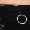 Strakke knielange rok van LateX gemaakt van zwart natuurlatex (dikte 0,35 mm). Met 3 grote decoratieve metalen ringen aan de voorkant en aan elke kant van de vastgelijmde tailleband. Met een rits aan de achterkant voor gemakkelijk aan- en uitkleden.