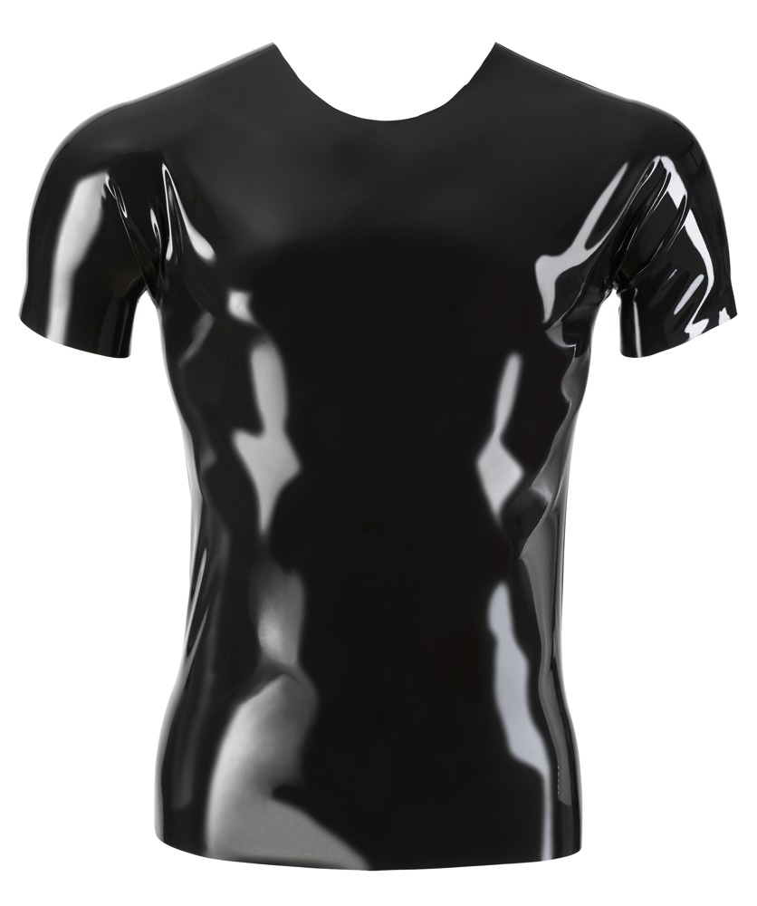 Zwart uniseks shirt van latex in klassieke, recht gesneden vorm met halve armen en ronde hals. Perfect voor het betreden van de latex-scene, omdat het shirt gecombineerd kan worden met veel bestaande outfits.
