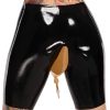 Zwarte latex fietsbroek van LateX met transparante urinezakinzet inclusief aftapkraantje.