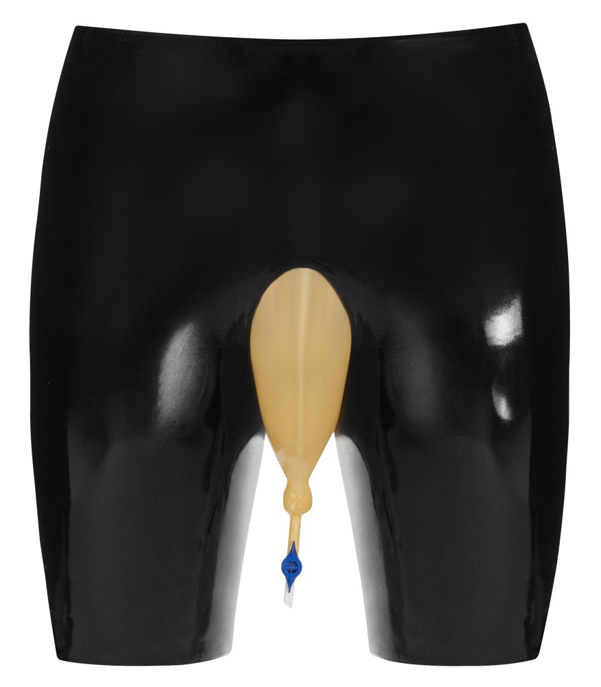 Zwarte latex fietsbroek van LateX met transparante urinezakinzet inclusief aftapkraantje.