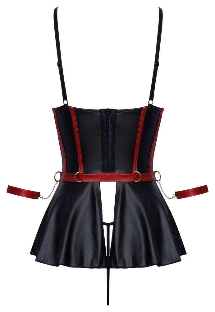 Longline, lift-up bra with flounce, crotchless thong and 2 arm cuffs in a set from Cottelli BONDAGE. In a sophisticated black matte look with red contrasting stripes in a waist-accentuating bodice look and silver-coloured details. The longline bra with its lightly padded underwire cups lifts the bust perfectly and presents it prominently with stretch straps. The flared skirt flounce, open at the back, sensuously plays around the hips. The straps at the front are decorated with decorative jewellery as additional eye-catchers. The straps, the neckline ribbons and the hook fastener at the back are adjustable. At the waistband there are 4 rings for the two included soft arm cuffs with their snap hook chains. The cuffs are adjustable with hook-and-loop fasteners. The matching small thong is invitingly open at the crotch.