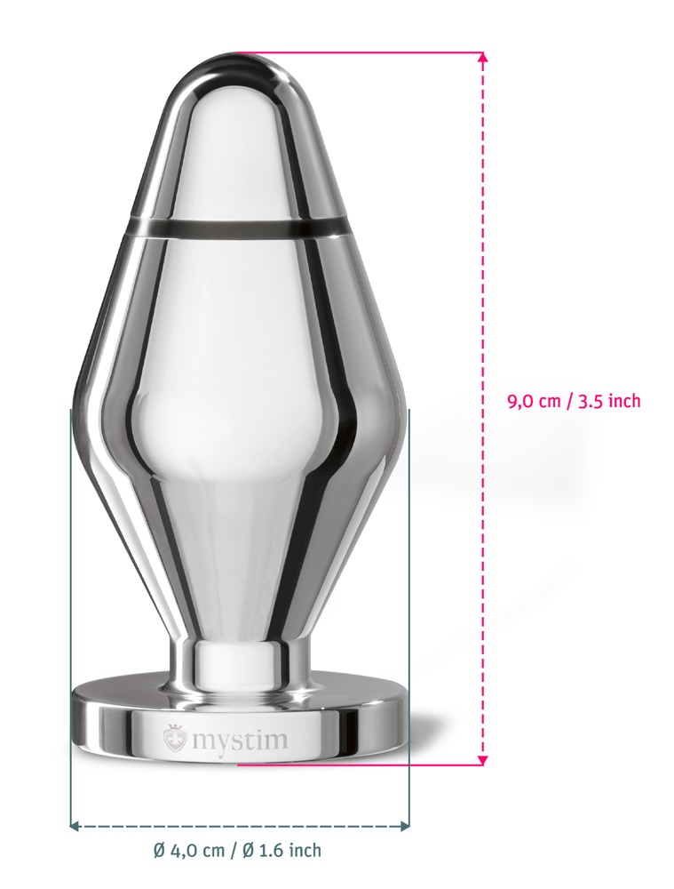 Little John buttplug van Mystim voor de Tension Lover of Pure Vibes stimulatie apparaat van Mystim. Met zijn diameter van 5 cm is de e-stim plug een ideaal anaal speeltje. Het gladde metaal loopt taps toe zodat de buttplug gemakkelijk kan worden ingebracht. Al na een paar centimeter zijn de twee polen geïsoleerd en is de elektrische stimulatie al vroeg voelbaar. Je kunt urenlang genieten van dit tintelende, wellustige genot, of de stimulatie variëren en intensiveren zodat je snel naar een sensationeel hoogtepunt wordt gedreven. De metalen plug kan voor gebruik verwarmd worden op de radiator of gekoeld in de koelkast.
