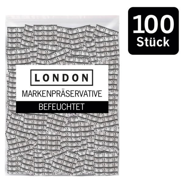 100 transparante Q600 condooms van het merk LONDON met vochtinbrengende coating en reservoir op siliconenbasis. Individueel in krimpfolie verpakt (6 x 6 cm) en losjes verpakt in een zakje.