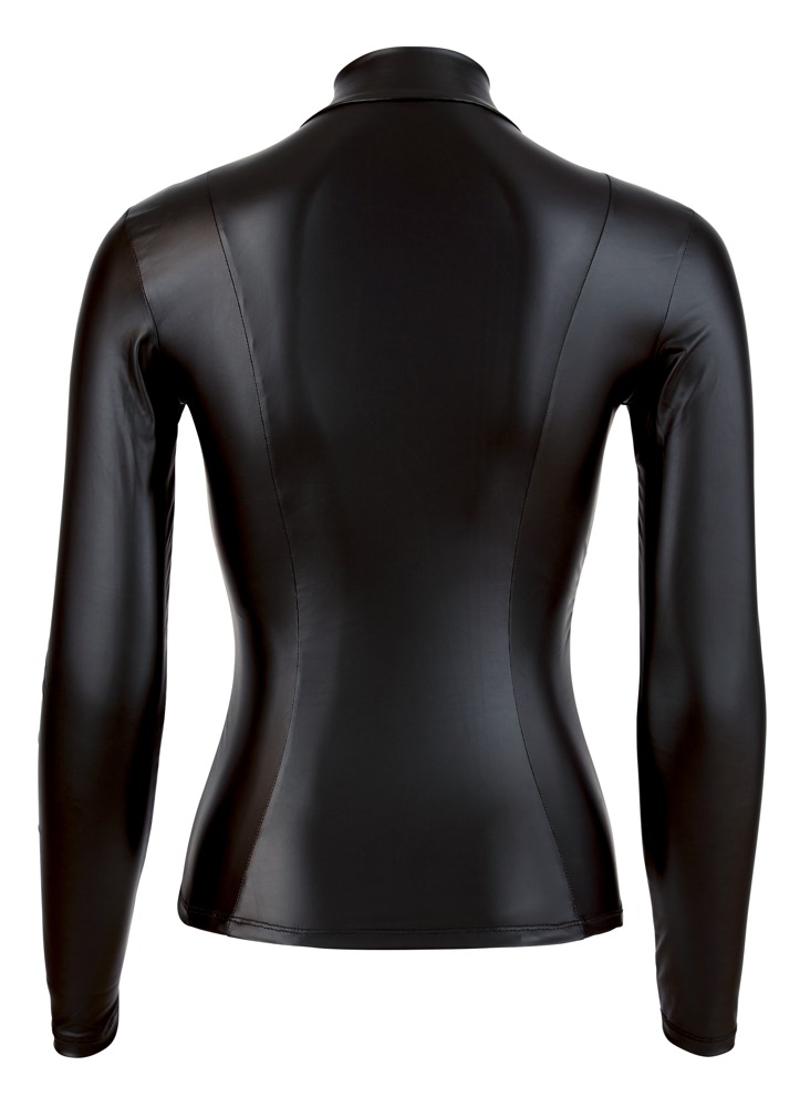 Wie houdt er niet van hete rondingen?! Deze zwarte top benadrukt de beste argumenten heel goed - zonder al te veel op voorhand te verklappen. De matglanzende top heeft een hoge hals met een klein opstaand kraagje en lange armen, maar dankzij de huiddichte en getailleerde snit is hij allesbehalve saai.