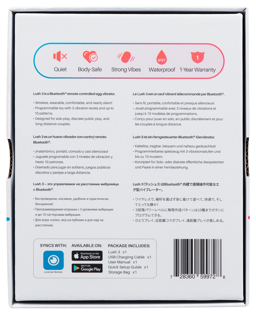 Het Lush 3 vibrerend eitje is compatibel met de Lovense app via Bluetooth. Hier kun je zelf talloze vibratieprogramma's maken en deze gemakkelijk bedienen en opslaan via je smartphone. Zelfs vanaf je partner over lange afstanden. Het Lush 3 vibratie-ei kan zijn vibraties ook via geluid activeren en synchroniseren met muziekritmes. 4 vibratiestanden in 3 intensiteiten kunnen ook gemakkelijk direct aan het smalle uiteinde van het speeltje worden bediend met een druk op de knop.