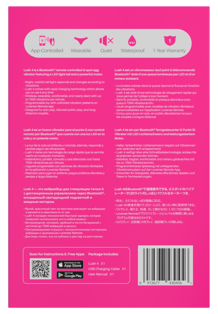 Het Lush 4 vibrerend eitje is compatibel met de Lovense app via Bluetooth. Hier kun je zelf talloze vibratie- en lichtshowprogramma's maken en deze eenvoudig bedienen en opslaan via je smartphone. Zelfs vanaf je partner over lange afstanden. Het Lush 4 vibratie-ei kan zijn vibraties ook via geluid activeren en synchroniseren met muziekritmes. De vibraties kunnen ook direct aan het smalle uiteinde van het speeltje worden bediend met een druk op de knop.