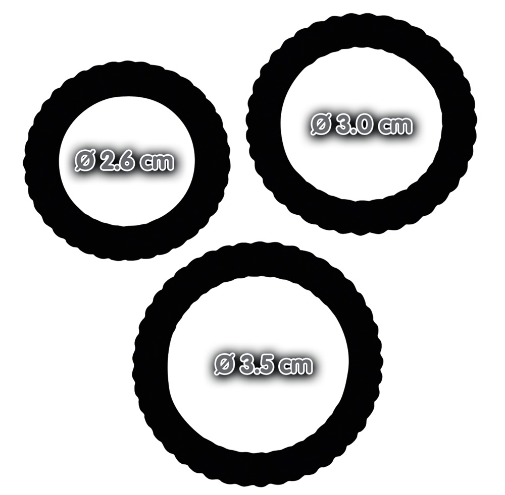 3 penisringen met gegroefde structuur met verschillende diameters (2,6, 3,0 en 3,5 cm). Ook ideaal voor testikelveters. Kan afzonderlijk of in combinatie worden gebruikt. Materiaal: silicone.