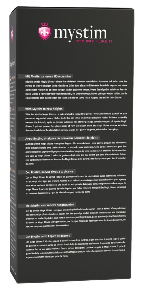 Bi-polaire e-stim handschoenen Magic Gloves van Mystim voor stimulatiestroomapparaat Cluster Buster, Tension Lover of Pure Vibes van Mystim. De Magic Gloves maken erotische massages op een sensueel elektriserende manier mogelijk. De handschoenen zijn gemaakt van bijzonder zacht materiaal. Ze geleiden zachte elektrische impulsen over het hele oppervlak dat met de handen wordt aangeraakt, waardoor een aangename tinteling op de huid ontstaat. Elke handschoen heeft zijn eigen elektrische polariteit, waardoor verschillende delen van het lichaam gericht gestimuleerd kunnen worden.
