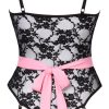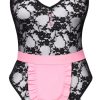 Crotchless suspender body including apron as a maid costume by Cottelli COSTUMES. Stretchy, soft body made from beautiful black lace with small pink buttons at the neckline. The straps can be adjusted to fit and the adjustable suspender straps are completely removable. Seductively open at the crotch. The small pink-coloured apron completes the playful look.