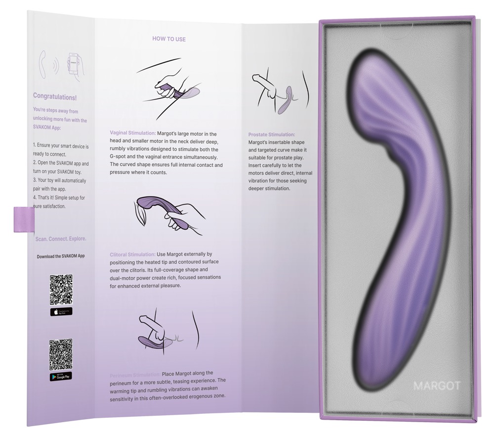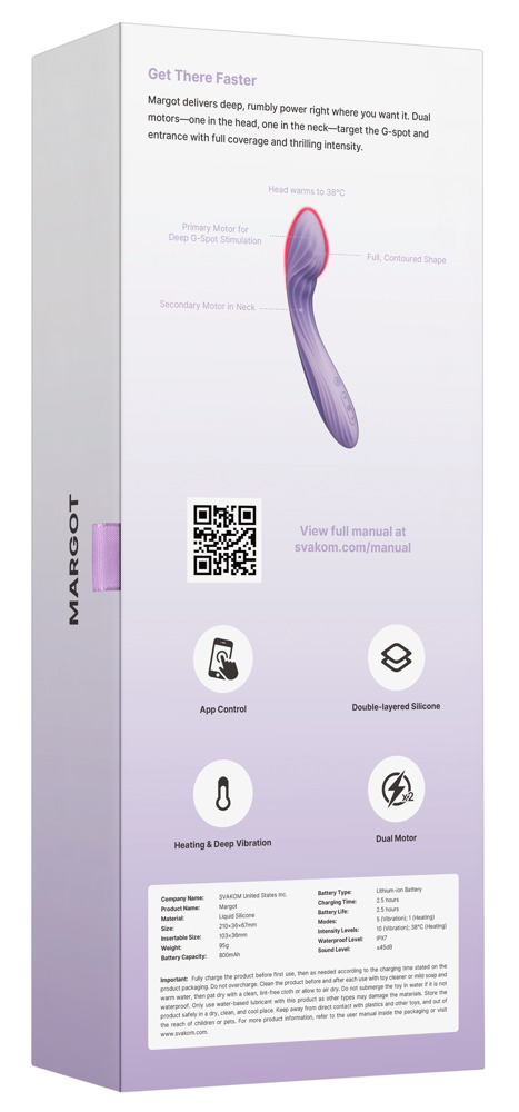 App-gestuurde tweemotorige G-spot vibrator Margot van SVAKOM. Ergonomisch perfect gebogen en met een afgeplatte kop voor gerichte stimulatie van genotspunten aan de binnen- en buitenkant van het lichaam. Vooral de G-zone en clitoris genieten van een intensieve massage! Zachte golfstructuren intensiveren ook de aanraking. De zachte en zijdeachtige dubbellaagse siliconen vibrator glijdt als bij toverslag over de huid en in intieme diepten. Hij verwent je met een enorme variëteit aan vibraties met één druk op de knop. Het stijlvolle lichtgewicht kan gemakkelijk en opwindend worden opgenomen in elk solo- of liefdesspel. Zelfs in bad en onder de douche, want Margot is waterproof.