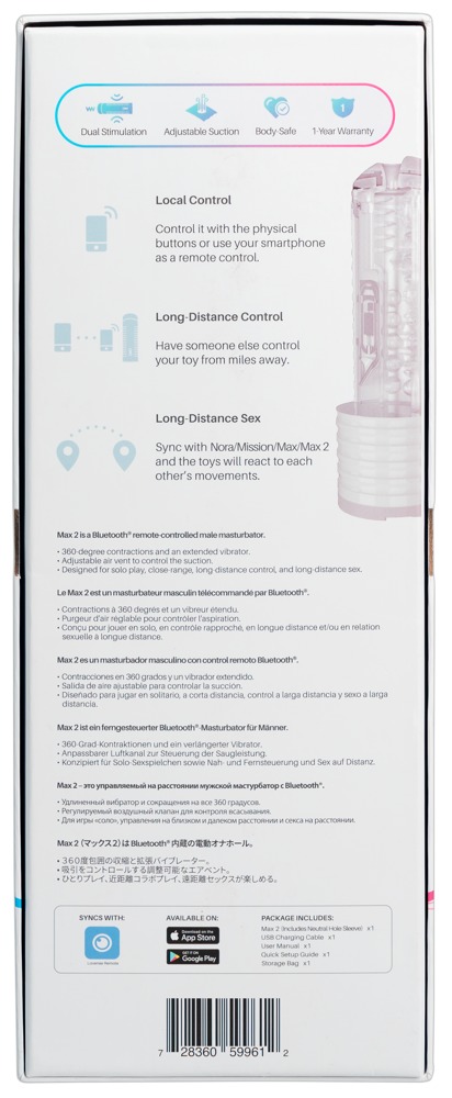 7 vibratiestanden en 3 samentrekkingsstanden kunnen direct op het speeltje worden bediend met één druk op de knop. Het is nog handiger met de Lovense app op je smartphone met veel extra functies. Heel handig via Bluetooth. Hier kun je je eigen stimulatieprogramma's maken en eenvoudig bedienen en opslaan via je smartphone. Zelfs van een verre partner. De Max 2 kan gekoppeld worden aan compatibele partnerspeeltjes voor sensuele seks op afstand. Teledildonische sensoren sturen dan de bewegingen van de partner door naar de masturbator - en vice versa. De masturbator kan ook worden gesynchroniseerd met interactieve video's, virtual reality, games en muziek.