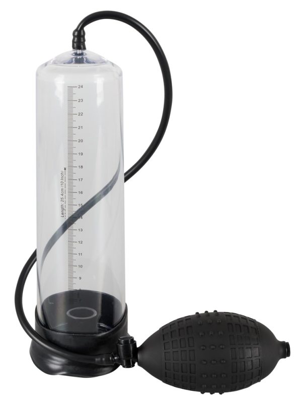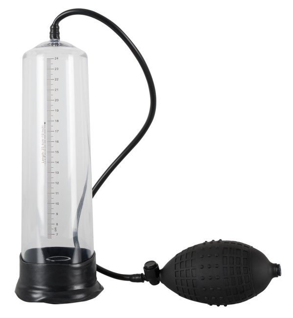 De met glijmiddel ingevette penis wordt in de transparante cilinder gestoken en bij de wortel stevig ingesloten door de zachte siliconen manchet. Met de handige pomp met geïntegreerd afvoerklepje wordt een vacuüm gecreëerd en de transparante cilinder met de meetschaal geeft de respectievelijke grootte van de penis aan.