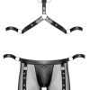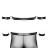 Harnasbroekje, borstharnas en 4 hand/arm boeien in een zwarte set van Svenjoyment BONDAGE. Broekje van zacht, rekbaar powernet met langere pijpjes. Opwindend transparant met mat-look details. Met dijharnas van verstelbare mat-look bandjes (drukknopen) en ringen. Met een onderrits aan de voorkant in een ondoorzichtig zakje. Borstharnas ook met verstelbare matte bandjes (drukknopen) en ringen. De bijgevoegde enkelboeien kunnen individueel worden aangetrokken door de vele ringen. De zachte enkelboeien kunnen snel worden aangetrokken en versteld met hun klittenbandsluiting.