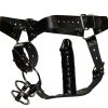 Unieke leren string voor echte fetisj professionals. Meervoudig verstelbaar en voorzien van 3 penis- en testikelringen en een opvallend geaderde latex anaaldildo.