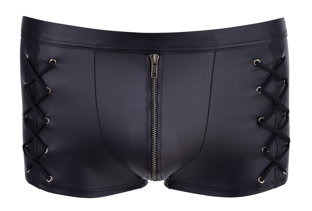 Zwarte broek met onderliggende koperen rits aan de voorkant. Aan de zijkanten met opvallende vetersluiting. Elastiek in de tailleband. Elastische, aaibare topkwaliteit met hoog draagcomfort. 90% polyester, 10% spandex, coating polyurethaan.