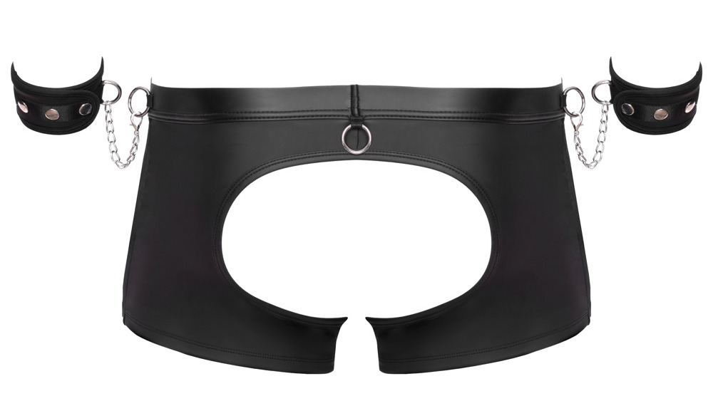 Zwart broekje van Svenjoyment Bondage inclusief zachte handboeien. Opwindend broekje zonder billen in een coole materiaalmix van mesh en matte look met zilverkleurige metalen details. Zacht en elastisch voor maximaal comfort. Met ritssluiting in de buidel. Manchetringen aan de beklede tailleband en aan de zijkanten, waarin de bijgevoegde handboeien snel kunnen worden vastgehaakt met hun karabijnkettingen. De zachte, matte manchetten kunnen snel worden aangetrokken en versteld met klittenband.