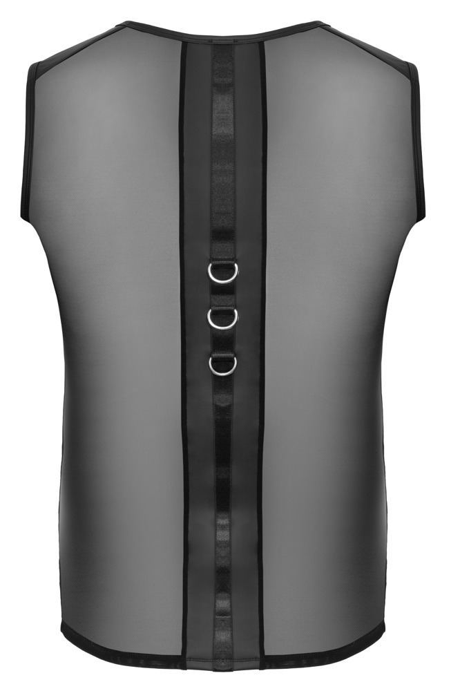 Zwart, mouwloos shirt van Svenjoyment Bondage inclusief zachte handboeien. Shirt van zacht, rekbaar visnet met matte details en zilverkleurige accessoires. Een mat-look inzetstuk met bondageringen in het midden van de voor- en achterkant, waarin de bijgeleverde handboeien snel kunnen worden vastgehaakt met hun karabijnkettingen. De zachte boeien in matte look kunnen snel worden omgedaan en versteld met klittenband.