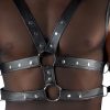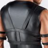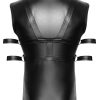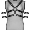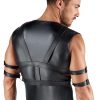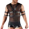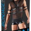 Mouwloos shirt en borstharnas en 4 hand-/mouwboeien in een zwarte set van Svenjoyment BONDAGE. Aaibaar shirt van fijn powernet aan de voorkant en een matte look aan de achterkant. Uitsparingen omrand in een matte look. Overal zacht en elastisch voor een hoog draagcomfort. Borstharnas met verstelbare bandjes in matte look (drukknopen). Ringen aan de zijkanten van de borst- en buikbanden waardoor de bijgevoegde enkelboeien kunnen worden aangetrokken. De zachte enkelboeien kunnen snel worden aangetrokken en versteld met hun klittenbandsluiting.