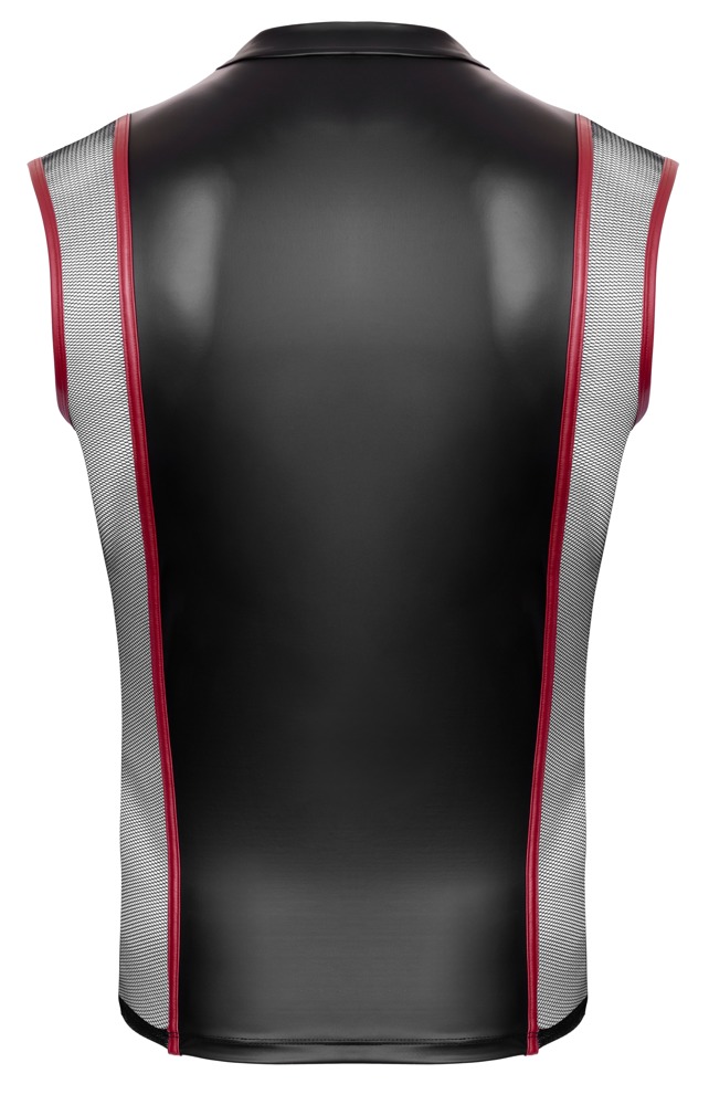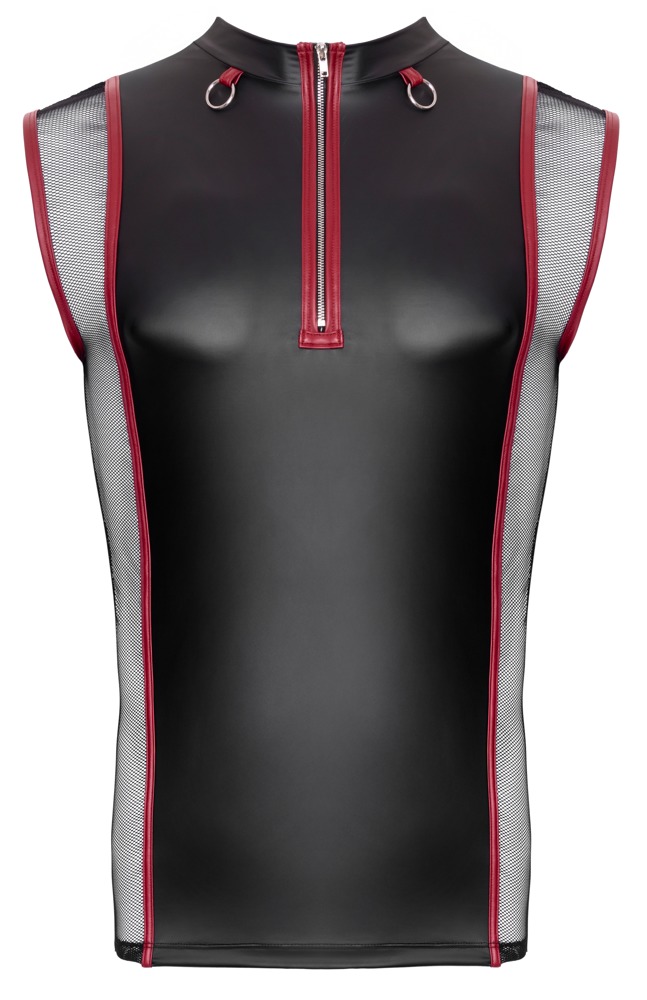 Mouwloos shirt van NEK met een nauwsluitende snit. Coole zwarte matte look met rode contrasterende strepen en zilverkleurige details. Met mesh inzetstukken aan de zijkanten en een korte ritssluiting aan de voorkant. Kleine opstaande kraag met sierringen aan de voorkant. Zacht en elastisch rondom voor optimaal draagcomfort.