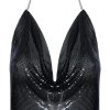 Rugloze crop top van Cottelli ACCESSOIRES met een prachtige watervalhalslijn. Gemaakt van kleine zwarte iriserende metalen pailletten. Zacht en aangenaam om te dragen. De zilverkleurige kettinghalterhals en de zilverkleurige ketting in de open rug kunnen individueel worden versteld en aangepast met karabijnsluitingen.