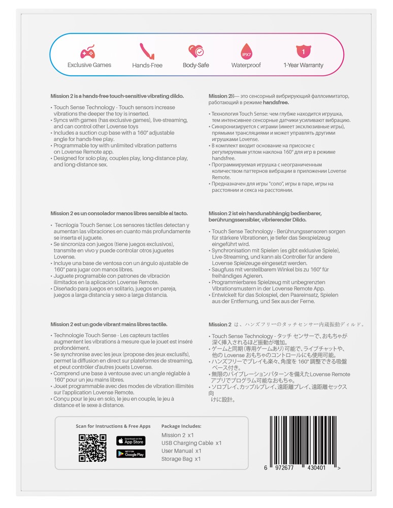 De Mission 2 is compatibel met de Lovense app via Bluetooth. Hier kun je zelf talloze vibratieprogramma's maken en deze gemakkelijk bedienen en opslaan via je smartphone. Zelfs vanaf je partner over lange afstanden. De Mission 2 kan gekoppeld worden aan compatibele partnerspeeltjes voor sensuele seks op afstand. Teledildonische sensoren geven dan de bewegingen van de partner door aan de vibrator - en vice versa. De Mission 2 kan zijn vibraties ook via geluid activeren en synchroniseren met muziekritmes en spelletjes.