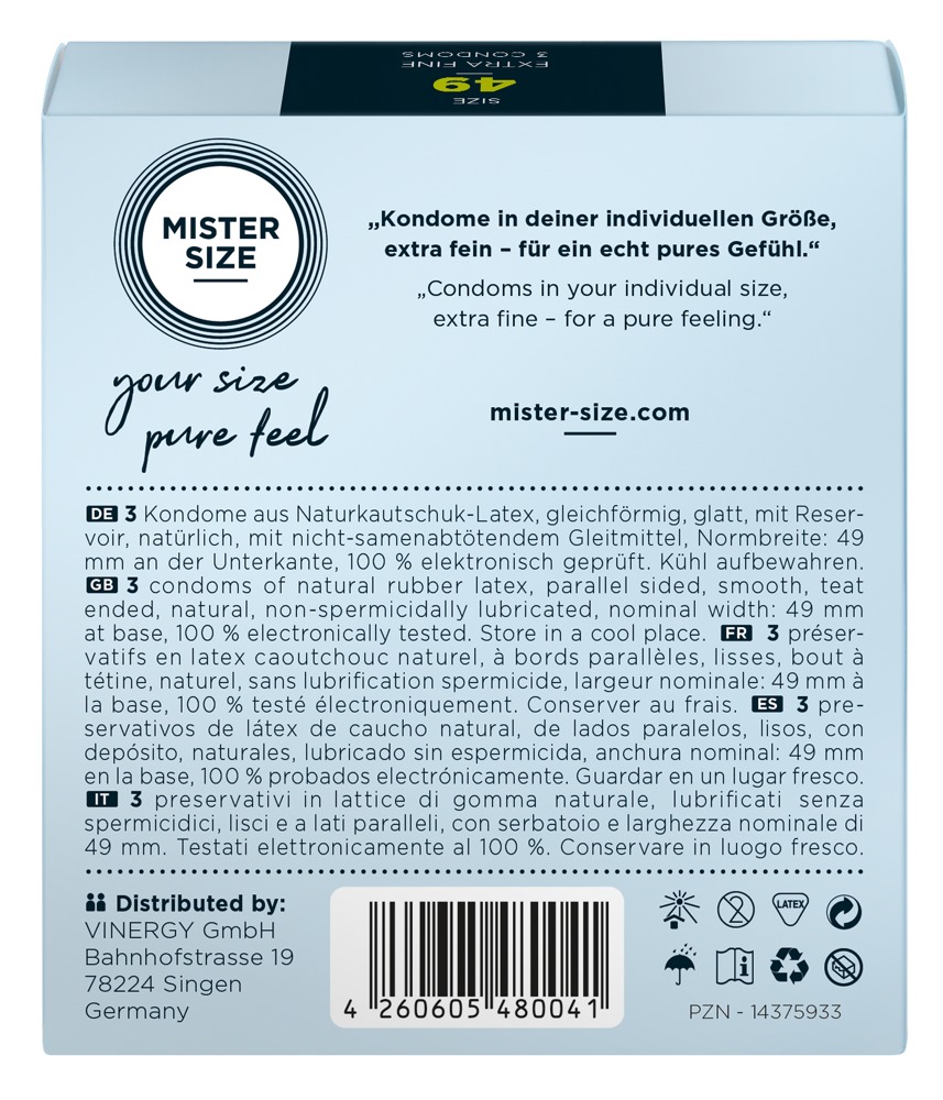 Transparante, flinterdunne Mister Size condooms (49 mm) van natuurlijk rubberlatex met glijmiddellaagje en reservoir. Veganistisch.
