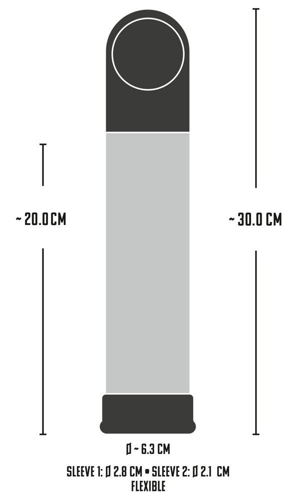 De transparante cilinder met meetschaal (cm) genereert snel en handig het zuigvacuüm. De penis kan opzwellen tot zijn maximale grootte en vorm. Meegeleverd worden 2 zijdezachte siliconen hulzen met verschillende diameters voor een perfecte afsluiting tussen de cilinder en het lichaam.