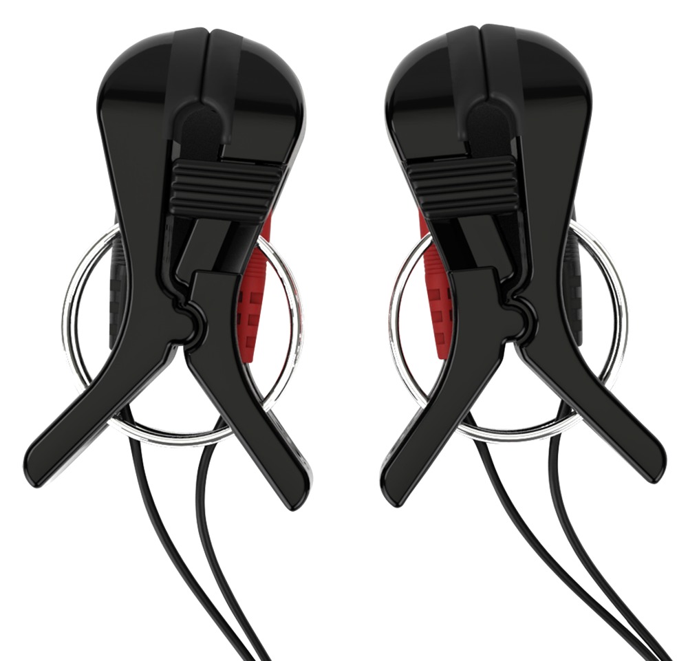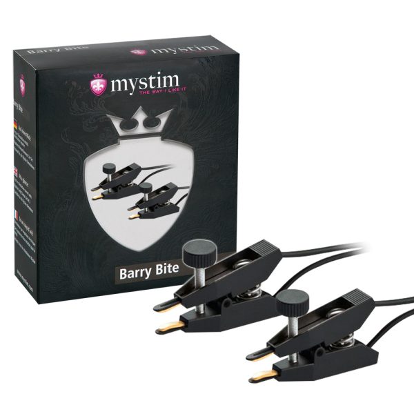 Bipolaire, elektrisch geleidende e-stimklemmen New Bites voor stimulatiestroomapparaat Tension Lover of Pure Vibes van Mystim. Voor stimulerend stroomplezier op tepels, lippen van de vulva en andere lichaamsdelen. Omdat elk van de klemmen bipolair is, wordt alleen het weefsel gestimuleerd dat precies tussen de twee helften ligt, waardoor het veilig is om beide tepels tegelijkertijd te stimuleren. De vergulde contacten van de klemmen zorgen ook voor een bijzonder intense en gelijkmatige stimulatie. De grijpintensiteit van de klemmen kan individueel worden ingesteld met kleine stelschroefjes.