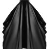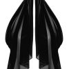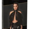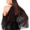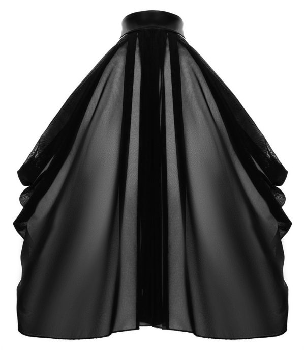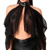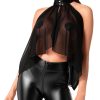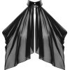 Luchtige en wijd uitgesneden Orgia-top van Noir volledig in fijne zwarte tule transparantie. Off-the-shoulder cape stijl met halternek halsband in powerwet look, met drukknoopsluiting aan de voorkant. Asymmetrisch model: kort en open aan de voorkant, over de armen en rug.