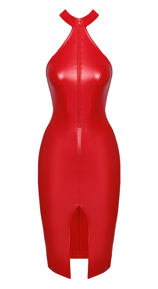 Off-the-shoulder Orgia jurk van Noir in knielengte. Strakke, getailleerde snit in een behaaglijke power-wet look. En in een geweldige kleur: felrood. Overal zacht en stretchy voor maximaal comfort. Ritssluiting over de hele lengte aan de voorkant, van de opstaande kraag tot de lange loopsplit.
