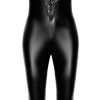 Mouwloze, strakke jumpsuit Orgia van Noir in een zwarte, elegante powerwet-look met fijn kant aan de bovenkant. Zacht en elastisch voor een nauwsluitende, comfortabele pasvorm. Grote uitsnede in het decolleté aan de voorkant. Er is ook een grote uitsnede boven op de rug. Kanten halternek met knoopsluiting.