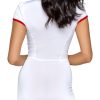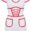 Semi-transparent short, white suspender dress in a nurse look by Cottelli COSTUMES with contrasting red details. Elastic all around in a tight figure-hugging cut with half sleeves and a large cut-out in the neckline. Two patch pockets in the front and a powernet insert beneath decorative lacing. Stand-up collar with 2 buttons in the neck. The adjustable suspenders are also completely removable.
