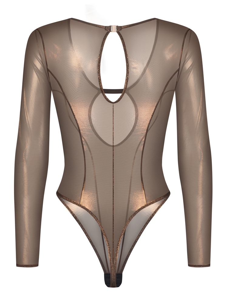 Soranna body met lange mouwen van Obsessive in een verleidelijke Rio-stijl met hoge beenuitsnijdingen. In bronskleurige semi-transparantie met een elegante glans. Overal elastisch en zacht en soepel voor maximaal comfort. Elegant decolleté met bandjes voor. Kleine uitsnijding op de rug met een gesp in de nek. Haaksluiting in het kruis.