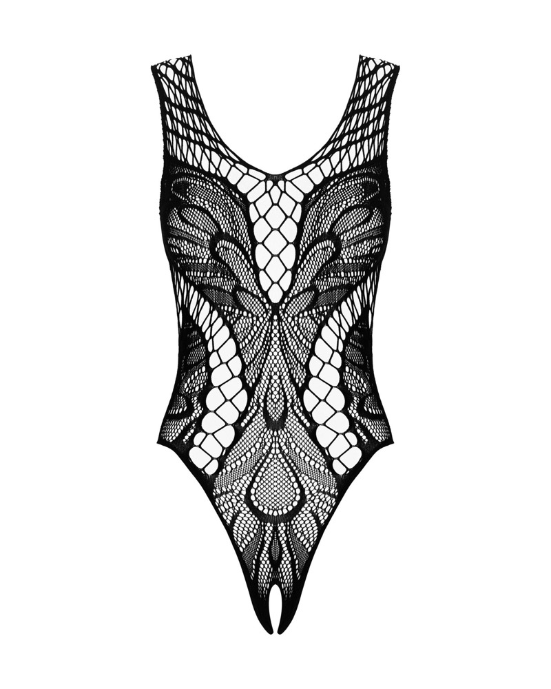 Zwarte bodysuit kruisloos B138 van Obsessive in verschillende netstructuren en met een unieke ingeweven look. Overal zacht en elastisch voor een hoog draagcomfort. Skimpy snit en met een grote cut-out aan de achterkant. Verleidelijk open bij het kruis.