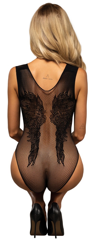 De B112 bodysuit van Obsessive heeft ongelooflijk zacht gaas dat zich aan de huid hecht. De voorkant is versierd met een groot bloemmotief, terwijl op de achterkant een paar vleugels in de stof zijn geweven. Het kruis is uitnodigend open. De brede banden kunnen ook wulps over de schouder worden gedragen.