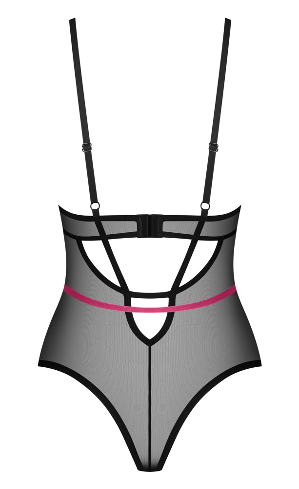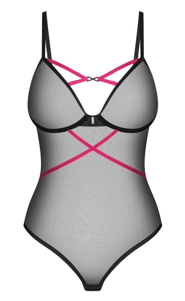 Novenes string body van Obsessive gemaakt van fijn zwart powernet met roze bandaccenten aan de voor- en achterkant. Zacht en rekbaar voor een hoog draagcomfort. Tussen de zachte cups met decolletébandjes en een prachtig strass-element. De bandjes en haaksluiting op de rug kunnen op maat worden versteld.