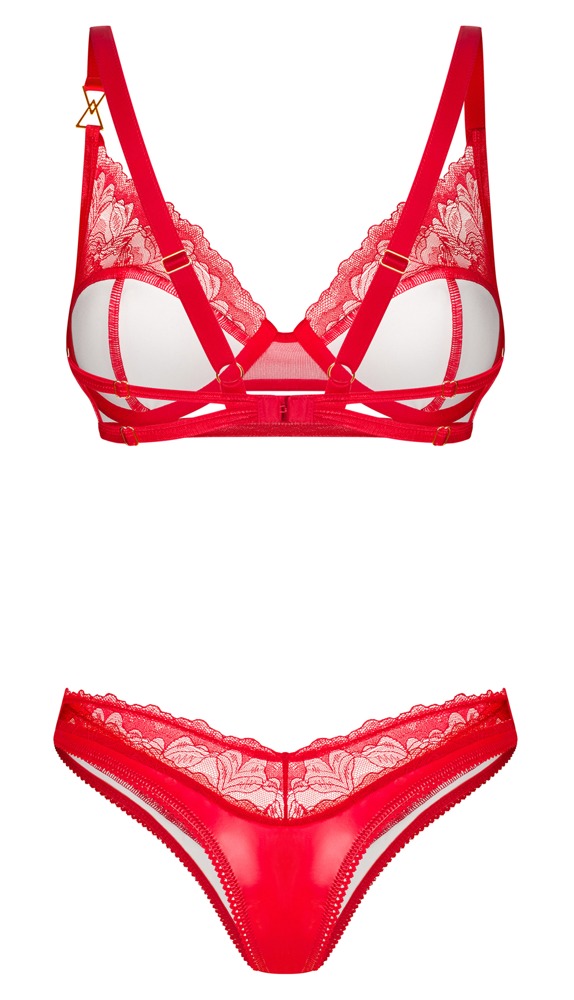 Aliosa setje van Obsessive met beugelbeha en rio string. Verleidelijke stijl in sensueel rood met een elegante gladde glans en fijn transparant bloemenkant. Overal zacht en elastisch voor een hoog draagcomfort. Beha met subtiel goudkleurig sierdetail tussen de beugelcups en op één bandje. De bandjes en de haakjessluiting achter kunnen op maat worden versteld.