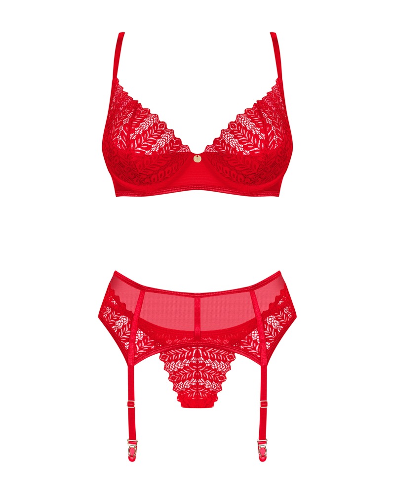 3-piece set Ingridia by Obsessive with an underwired bra, suspender belt and thong. All in red transparent fabric with beautiful lace details. Soft and stretchy all over for high wearing comfort. Padded underwired cups with a small decorative element for a beautiful cleavage. Bra and suspender belt with adjustable hook fastener at the back. The straps and suspender straps can also be adjusted to fit.