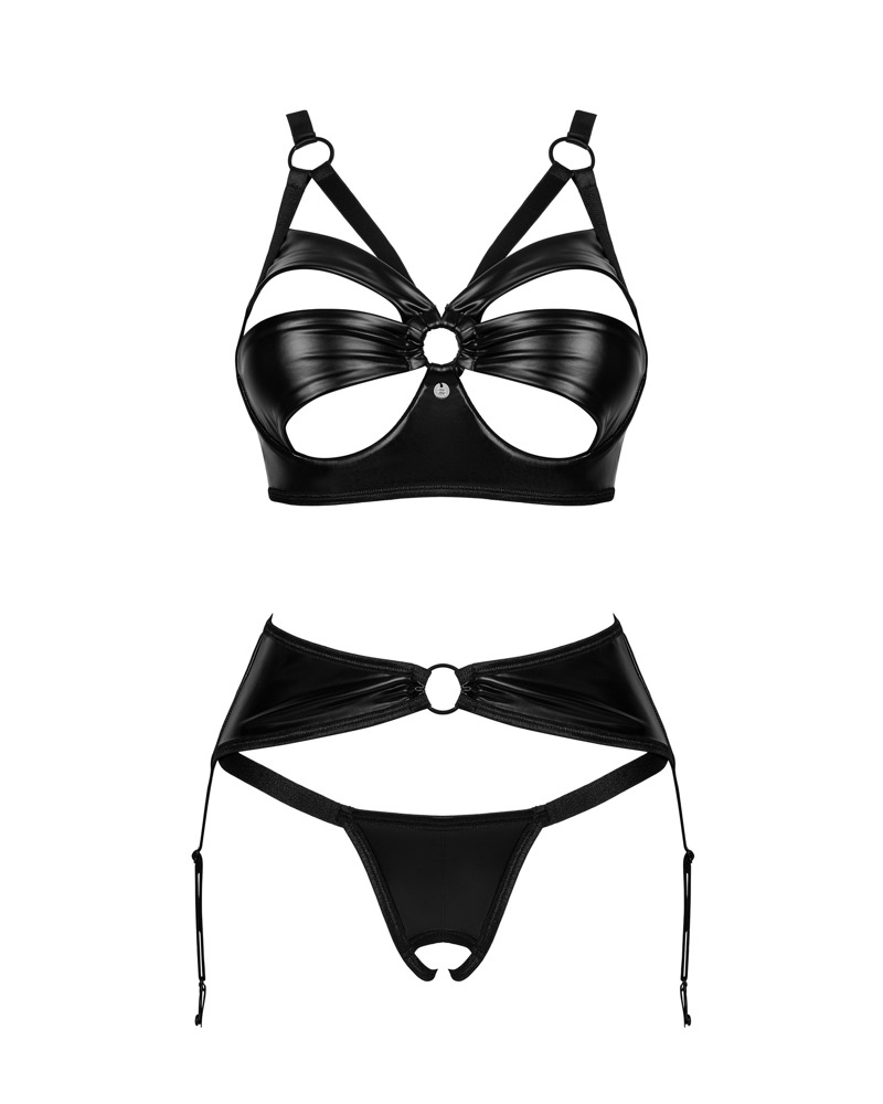 3-delige set Armares van Obsessive met beugelbeha, jarretelgordel en kruisloze string. Geheel in een trendy wetlook die elastisch is en zacht aanvoelt. Cups met verleidelijke uitsnijdingen en klein juwelenelement. De bandjes zijn slim vormgegeven met ringen en kunnen op maat worden versteld - net als de haaksluiting achter. De jarretelgordel heeft een ring aan de voorkant en een verstelbare haaksluiting aan de achterkant. De jarretelbandjes zijn ook verstelbaar. De wetlook string is verleidelijk open bij het kruis