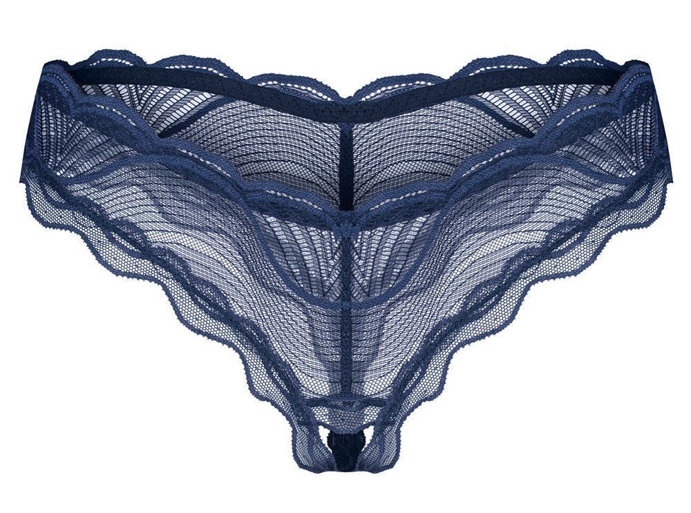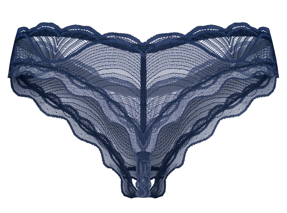 Riostring ouvert Nightly Blue van Obsessive in sensuele transparantie met filigraan kantoptiek in stijlvol blauw-op-blauw. Overal zacht en elastisch voor een hoog draagcomfort. Verleidelijk open bij het kruis.