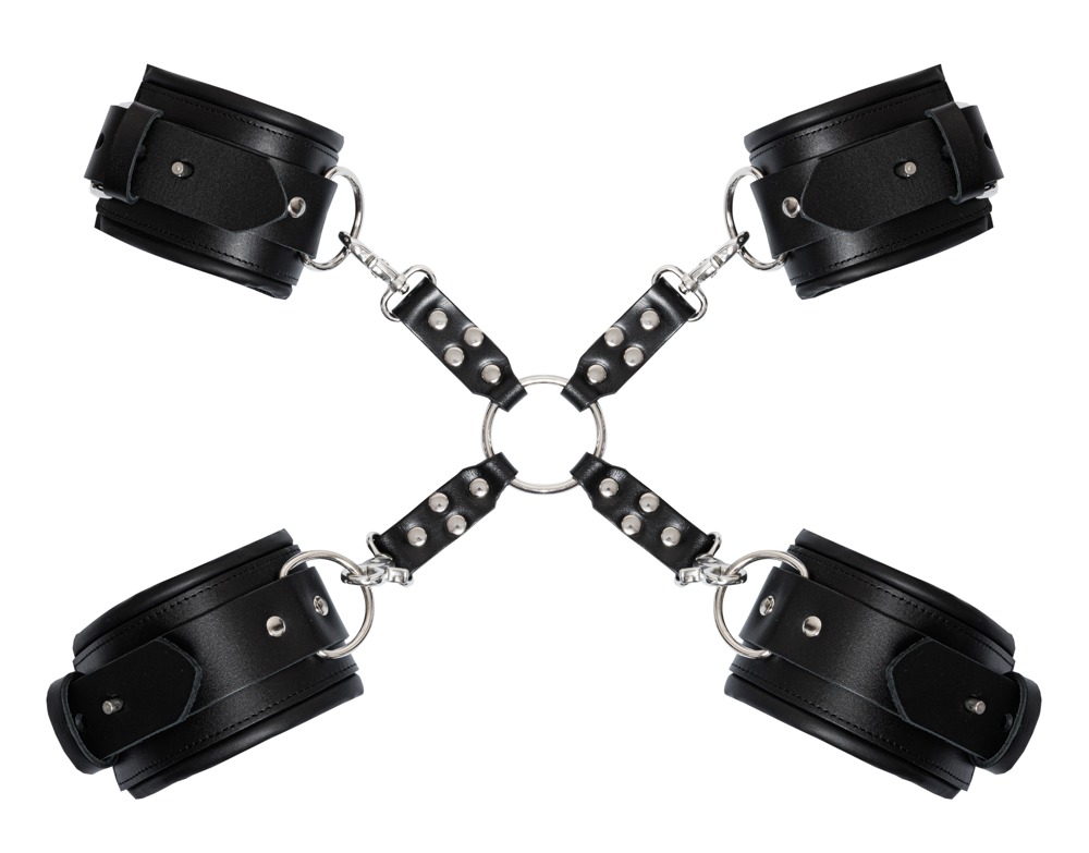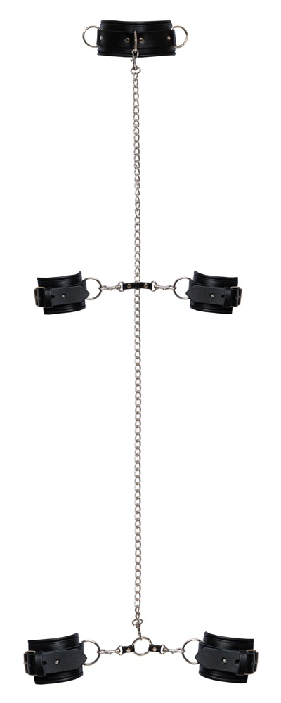 Hoogwaardige complete bondageset van ZADO gemaakt van zwart leer met zilverkleurige accessoires. Bestaande uit een nekboei met riem, handboeien en enkelboeien, evenals een hogtie en lange karabijnketting om de boeien aan elkaar te bevestigen. 4 goudkleurige sloten met sleutels om de handboeien en enkelboeien vast te zetten zijn ook inbegrepen! Alle brede leren boeien zijn gemaakt van hoogwaardig leer met gestikte randen. Dikke en zachte vulling voor een hoog draagcomfort. Verstelbaar met gespsluitingen. Elk met stevige ringen voor de karabijnhaken van de enkelboeien of ketting. Verbindingsketting met een karabijnhaak bovenaan en 2 karabijnhaken aan het uiteinde, evenals een uitschuifbare dubbele karabijnhaak. Leiband met karabijnhaak aan het ene uiteinde en handlus aan het andere.