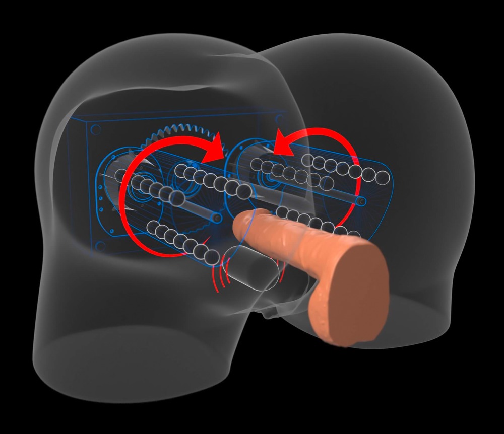 31 cm lang, 30 cm breed, 18 cm hoog. Vagina en anus elk 13,3 cm diep, beide Ø strak en rekbaar. Gewicht: 9.389 kg.