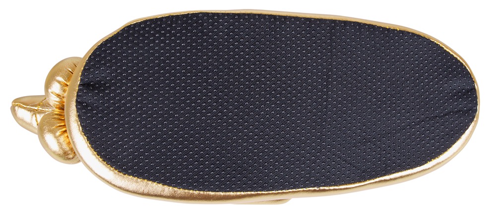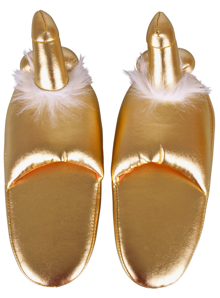 Goudkleurige slippers van zacht materiaal met een penis en testikels op de teen. Eén maat: ca. 37 tot 43. Materiaal: overtrek 100% polyester, voering 100% polypropyleen.