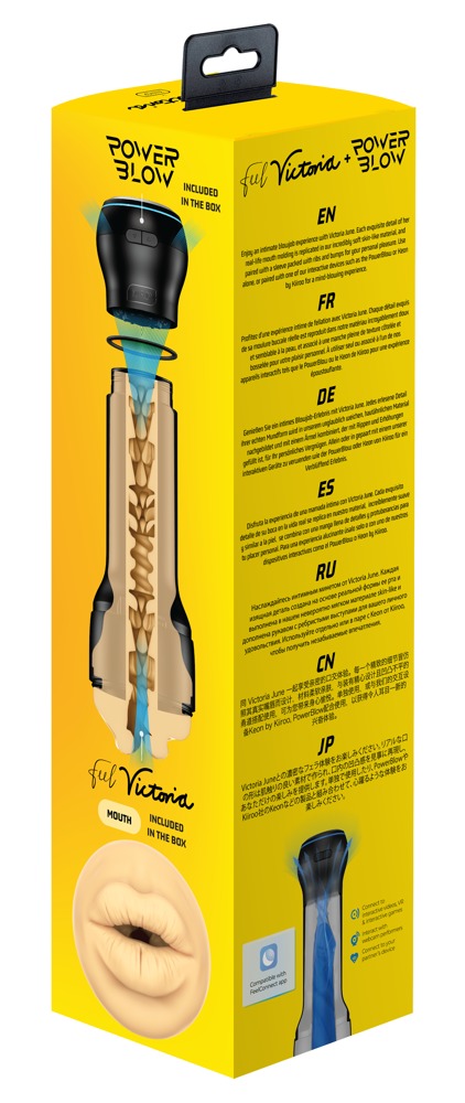 Voel je Victoria June Mouth masturbator + PowerBlow zuigopzetstuk in een combo set van Kiiroo.