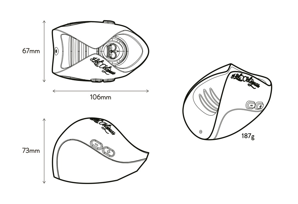 Totale lengte 10,6 cm, breedte 6,7 cm, hoogte 7,3 cm. ABS, siliconen.