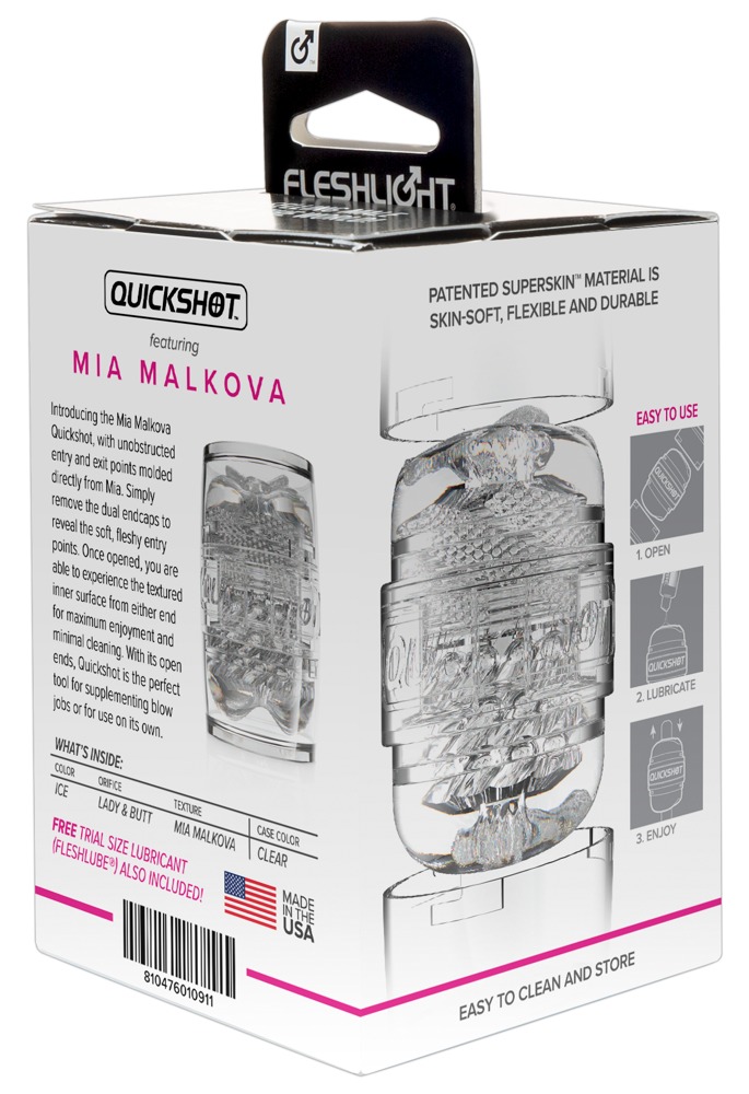 Kleine, handige Quickshot Mia Malkova masturbator van Fleshlight in een transparante, easy-grip behuizing met beschermkapjes. Aan beide kanten te gebruiken voor handjob: één kant in vagina-look, één kant in anus-look. Beide openingen oorspronkelijk gevormd door erotische ster Mia Malkova! En het genotskanaal gemaakt van huidachtig SuperSkin materiaal met zijn verschillende stimulatiestructuren komt heel dicht bij een realistische ervaring met Mia. Mia Malkova heeft zelfs de verpakking gesigneerd met haar handtekening!